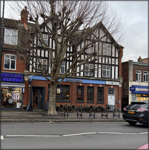 The site is located on Central Road (A2043), a busy commercial corridor comprising retail uses with residential properties located on surrounding side roads. The development involves the change of use of the upper floors to residential, together with a two‑storey rear extension, alterations to fenestration, and the provision of cycle and refuse storage.